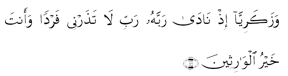 Artinya : Dan (ingatlah kisah) Zakaria, tatkala ia menyeru Tuhannya:“Ya Tuhanku janganlah Engkau membiarkan aku hidup seorang diri dan Engkaulah waris yang paling Baik". QS. Al-Anbiya ayat 89.
