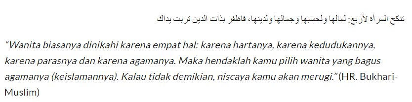 Dalam agama Islam ada 4 kriteria untuk memilih jodoh lebih tepatnya istri sehingga terbentuk rumah tangga yang samawa.